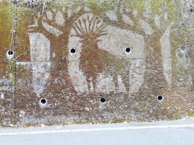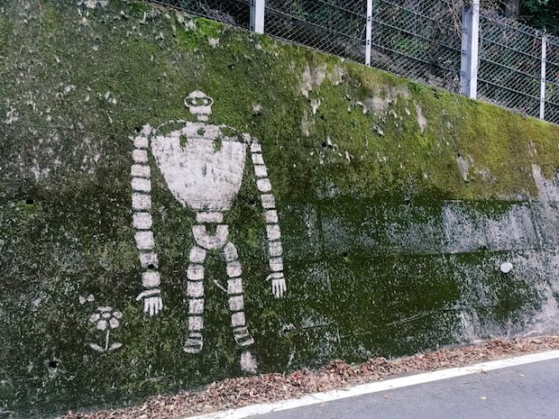 Shared by @hana_inko on Twitter on December 18th, the moss art “graffiti” was spotted along the Sadamine Pass that links the city and village in Saitama Prefecture, northwest of Tokyo. The artist has apparently created his or her murals by removing or scraping off the moss that had grown on the wall.