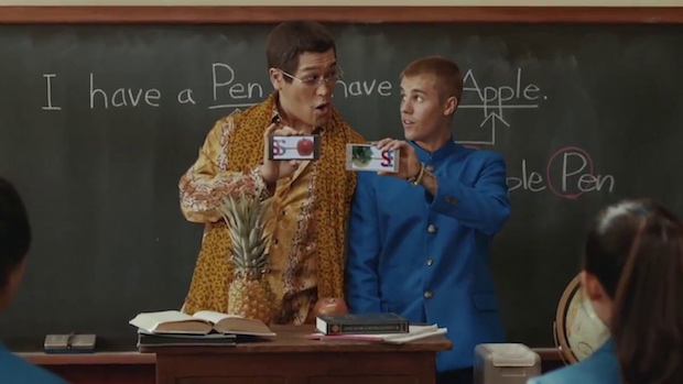 In the next, 60-second ad Justin Bieber is seen walking around the school and greeting other “super students”. He then visits Piko Taro’s “English” class to do some funny PPAP-inspired business with two phones.