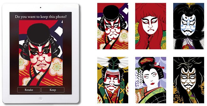 There are tablets in the Kabuki Gate where you can take your picture and then match it to Kumadori Kabuki makeup. The final image of yourself as a Kabuki star can then be sent to your own phone.