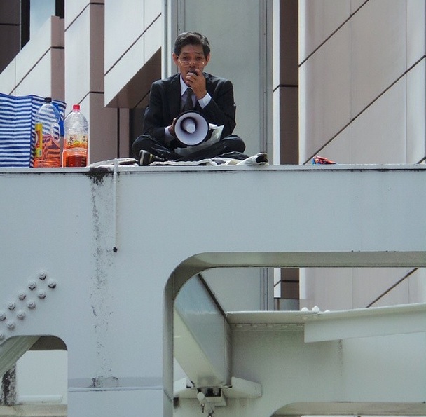 At around 1-2pm a man sat on the girders above a pedestrian footbridge near Shinjuku Station’s busy South Exit area with a megaphone and two bottles containing dark liquid. He wore a suit and sat on a small mat. He spoke into the megaphone for some time, announcing that he was going to kill himself in protest at the government’s push to involve Japan more in war.