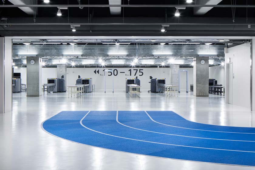 The floor of the terminal features blue running tracks (now you really can spring for your flight) and other minimal but striking flourishes. The designers wanted to create a positive impression of “low cost” and so opted for chic simplicity.