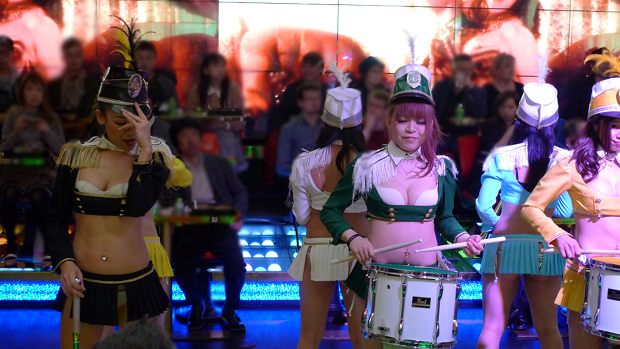 Now to the show itself. Words fail me. It features essentially about 20 dancers who play instruments and, well, dance. Stylistically it’s the biggest smorgasbord of kitsch and the burlesque you are likely to see outside of a Takarazuka performance, only with Kabukicho strip culture and Akihabara chika aidoru motifs thrown in for good measure. It is also erotic; all the girls are scantily clad, plus some had busts we hadn’t seen in Japan except in a porn film.